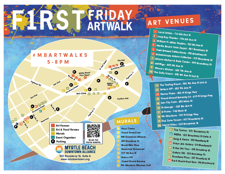 Make plans to join us each month for our F1rst Friday Art Walk, held throughout downtown Myrtle Beach.